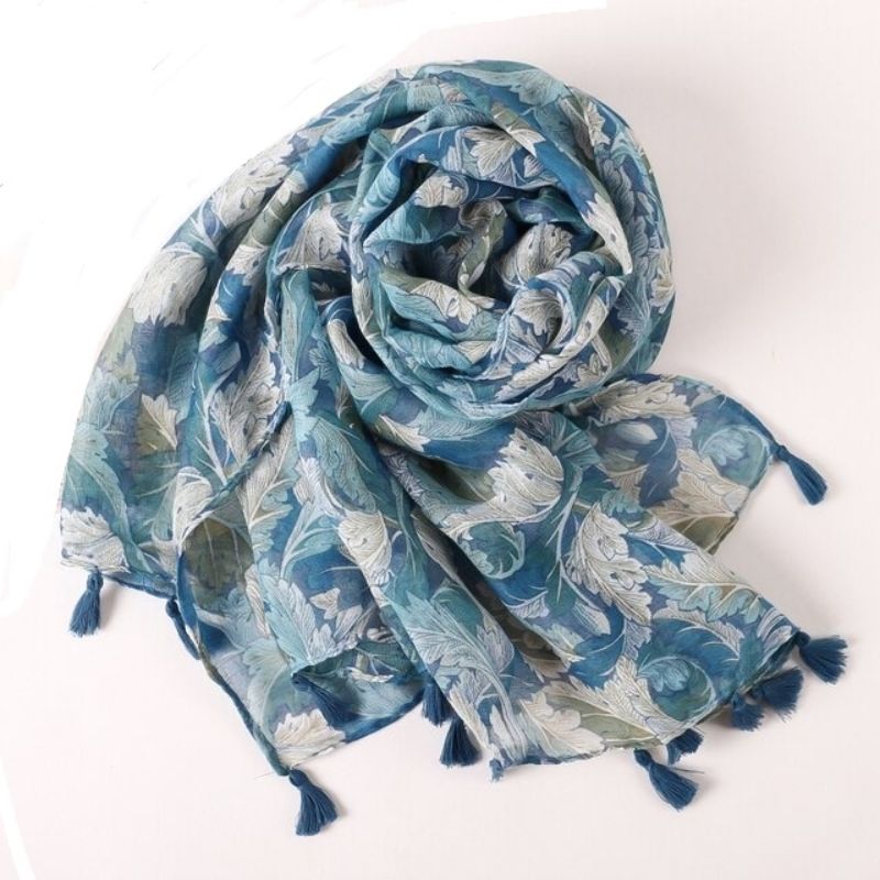 This beautiful A Single Strand Acanthus Scarf is crafted from lightweight polyester and features elegant tassel fringe for added flair. Inspired by the timeless designs of William Morris, the scarf showcases an intricate acanthus leaf print in stunning shades of blues and greens. Perfect for adding a touch of classic elegance to any outfit, this versatile accessory is ideal for year-round wear, bringing both style and sophistication to your wardrobe with its artful, nature-inspired design.