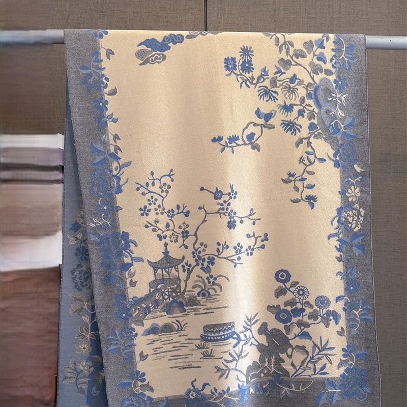 This exquisite A Single Strand Asian Garden Scarf is crafted from a soft polyester and viscose blend, providing a luxurious, cashmere-like feel. The oblong shape features elegant fringed edges, while the design captures the serene beauty of an Asian garden, with a pagoda, ornamental trees, graceful blossoms, flowing vines, and delicate foliage. Set against a French blue and ivory background, this scarf adds a touch of tranquility and sophistication to any outfit, perfect for both casual and formal occasions.