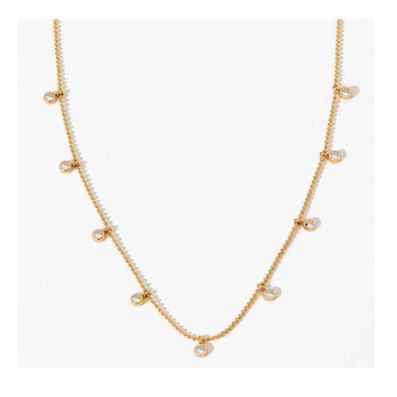 This elegant A Single Strand Bezel Set Drop Necklace features clear crystal drops beautifully set along a gold-tone beaded metal alloy chain. The sparkling crystals catch the light, adding a touch of refined brilliance to any outfit. Perfect for both everyday wear and special occasions, this necklace blends classic elegance with a modern twist, making it a versatile accessory that effortlessly elevates your style with its timeless charm and subtle shimmer.