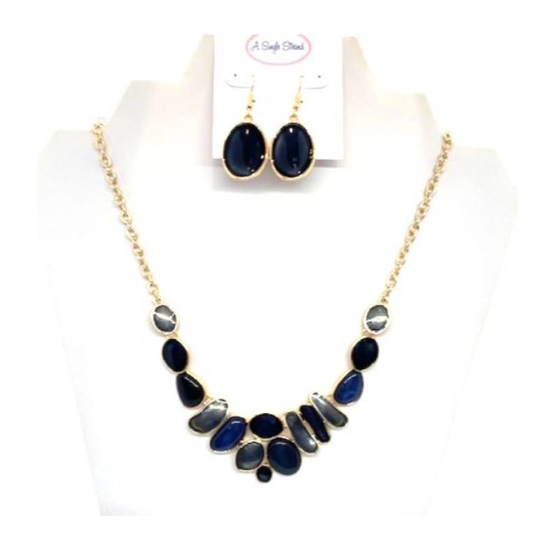 This vibrant A Single Strand Bubbles Necklace and Earring Set features playful blue bubbles with shimmering gold accents, elegantly arranged on a gold-tone metal alloy chain. The matching bubble earrings complete the set, creating a fun and stylish look. Perfect for adding a pop of color and charm to any outfit, this set is ideal for both everyday wear and special occasions, offering a unique blend of modern design and vibrant tones.