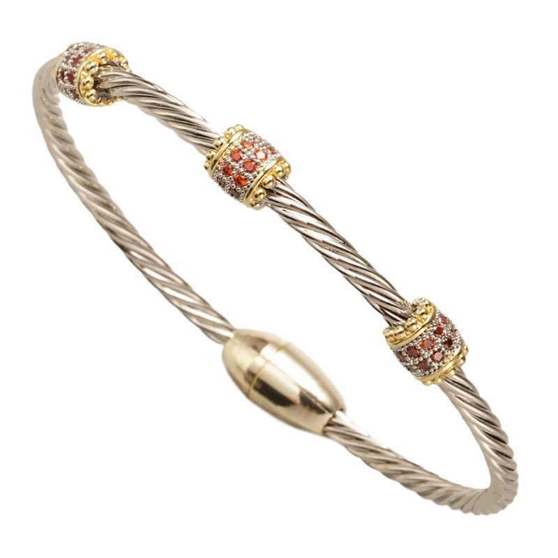 This stunning A Single Strand Magnetic Bracelet features a twisted silver design, crafted from durable metal alloy, with a gold magnetic closure for easy on and off. The bracelet is elegantly accented with three gold barrels adorned with sparkling garnet hued cubic zirconia, adding a touch of brilliance and sophistication. Perfect for both casual and special occasions, this bracelet seamlessly combines style and functionality, making it a versatile and eye-catching accessory for any jewelry collection.