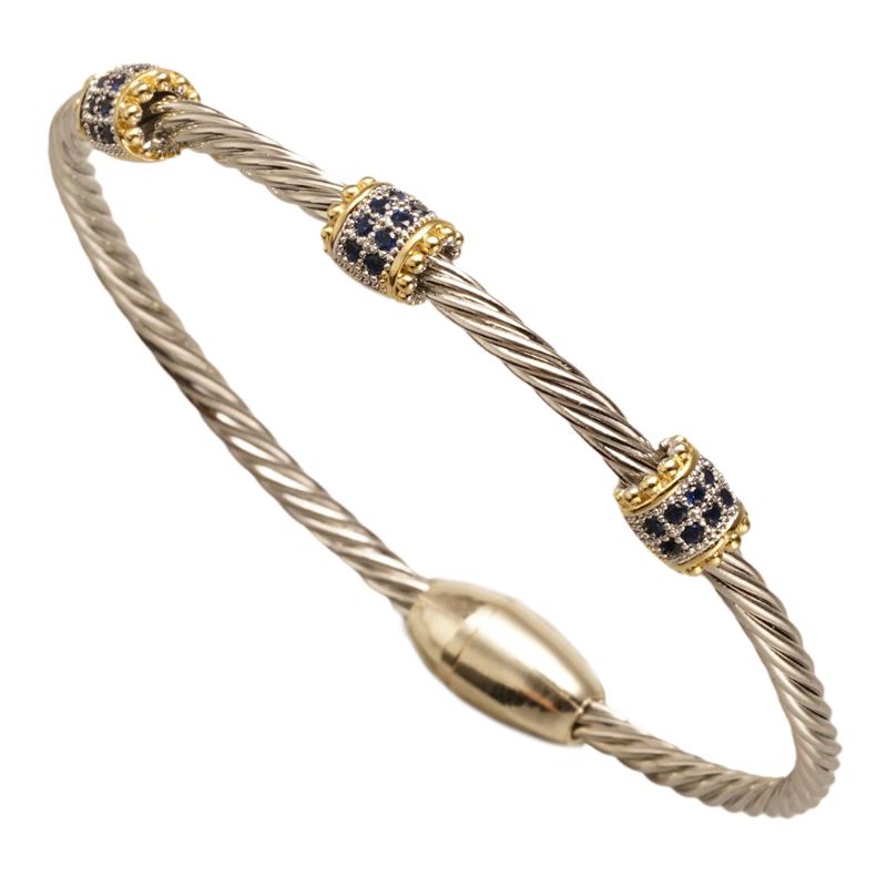 This stunning A Single Strand Magnetic Bracelet features a twisted silver design, crafted from durable metal alloy, with a gold magnetic closure for easy on and off. The bracelet is elegantly accented with three gold barrels adorned with sparkling sapphire hued cubic zirconia, adding a touch of brilliance and sophistication. Perfect for both casual and special occasions, this bracelet seamlessly combines style and functionality, making it a versatile and eye-catching accessory for any jewelry collection.