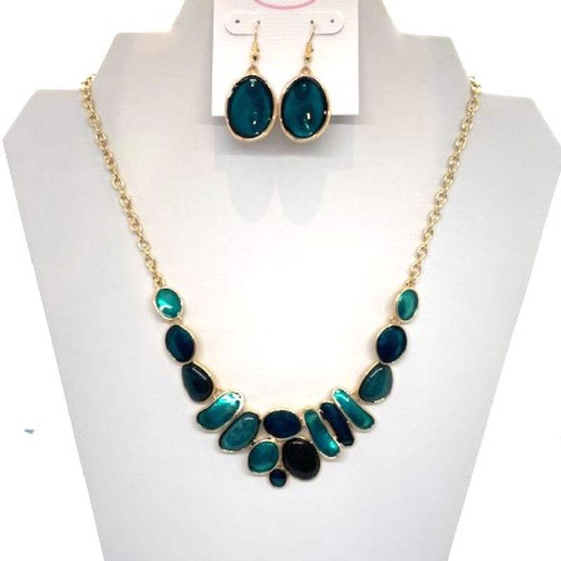 This vibrant A Single Strand Bubbles Necklace and Earring Set features playful teal bubbles with shimmering gold accents, elegantly arranged on a gold-tone metal alloy chain. The matching bubble earrings complete the set, creating a fun and stylish look. Perfect for adding a pop of color and charm to any outfit, this set is ideal for both everyday wear and special occasions, offering a unique blend of modern design and vibrant tones.
